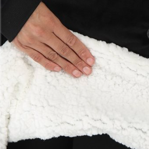 A close-up of a hand gently touching a thick, fluffy white fabric, highlighting its soft, plush texture and cozy feel.